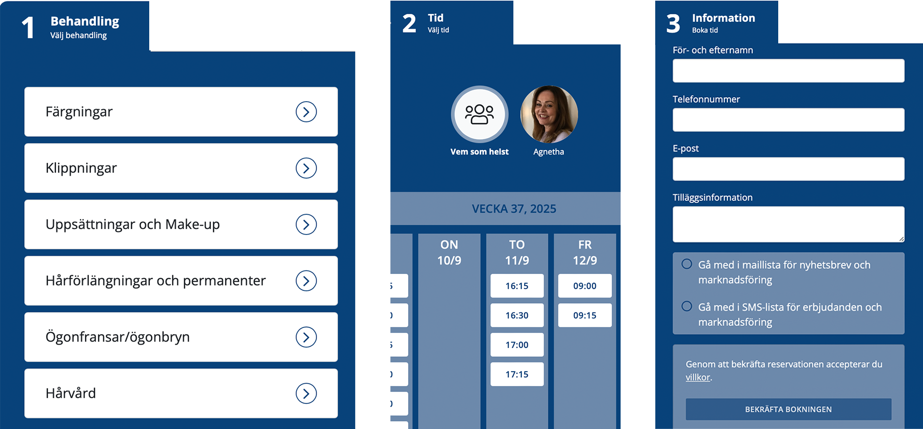 1. välj behandling 2. välj tid 3. fyll i din information och bekräfta bokningen